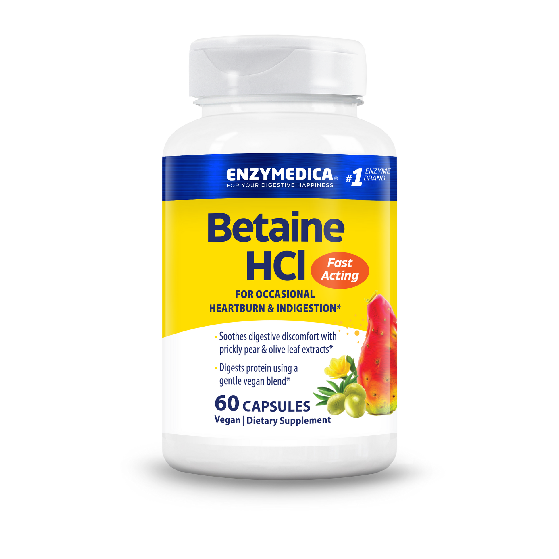As we age, we produce less digestive acid, leading to occasional heartburn and indigestion. Betaine HCl and Pepsin, a protein-digesting enzyme, can provide relief for those with occasional heartburn.