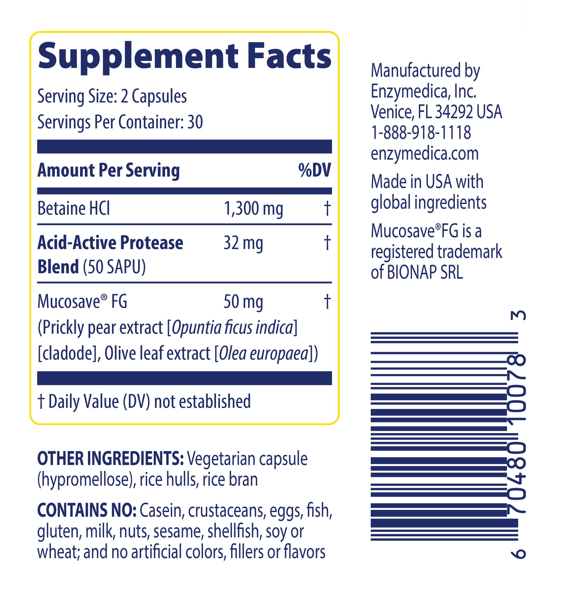 Betaine HCl increases acid levels so your stomach can naturally digest properly.* Enzymes are added to support gentle digestion, while MucoSave, a combination of prickly pear and olive leaf extracts, soothes the stomach lining.*