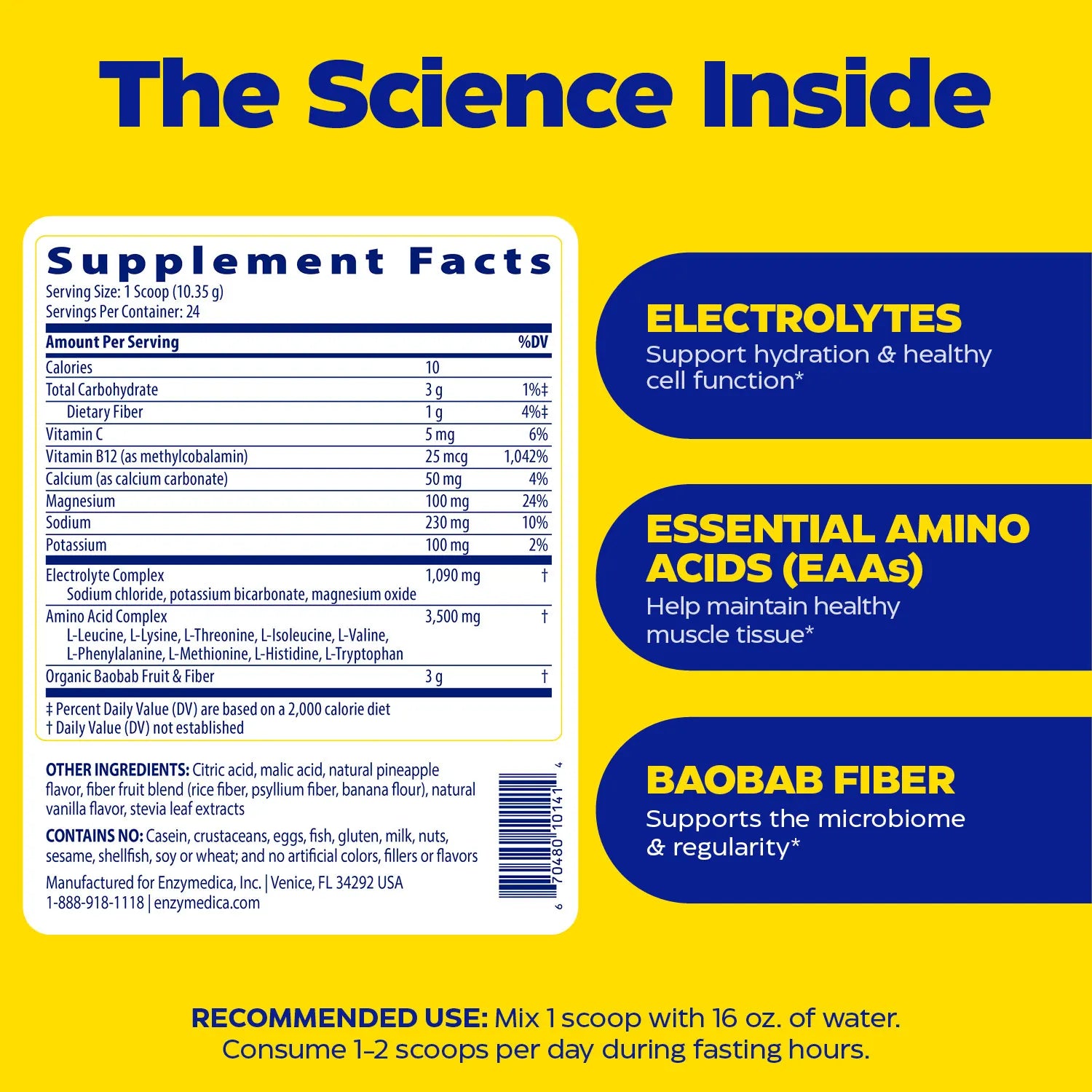 Electrolytes support hydration & healthy cell function, EAAs help maintain healthy muscle tissue and fiber supports the microbiome & regularity.*